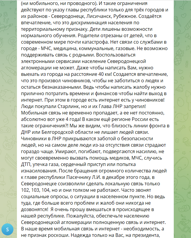 «Ось вже 4 роки у населення зовсім відсутній мобільний зв’язок та інтернет. Такі обмеження діють за указом глави республіки лише для трьох міст та їх районів – Сєвєродонецьк, Лисичанськ, Рубіжне. Складається враження, що це дискримінація населення за територіальною ознакою(…)Навіть щоби написати Вам, потрібно виїхати з міста на відстань 40 км! Складається враження, що це свавілля чиновників, щоб не дбати про людей та залишитися безкарними».