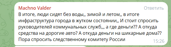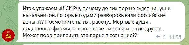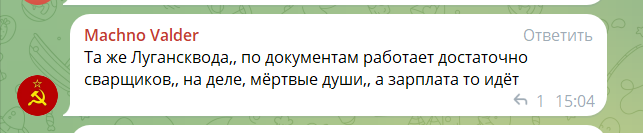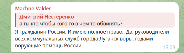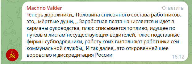 «Підставні фірми, завищені кошториси(…) У підсумку люди без води взимку та влітку, інфраструктура у жахливому стані. І варто запитати у керівників комунальних підприємств: де гроші? А звідки статки на шикарні авто та дорогі будинку? Пора запитати про це СК РФ (…) Дорожники: половина чисельного складу — мертві душі. Заробітна плата нараховується, але йде в кишені керівництва, паливо списується. Та же Луганськвода: по документа працює вдосталь зварювальників, а на ділі — мертві душі. А зарплата нараховується (…)Це — відверте крадівництво та дискредитація Росії».