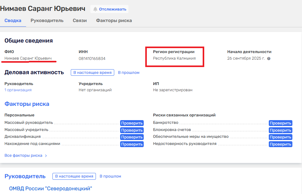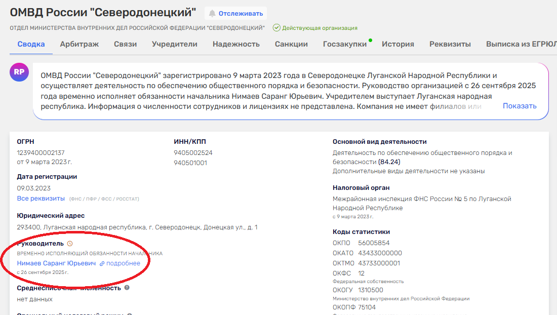 26 вересня тимчасово виконуючим обов’язки начальника Сіверськодонецького відділу внутрішніх справ став поліцейський чиновник Німаєв Саранг Юрійович. Про нього майже немає публічної інформації, однак, за даними дослідників, він походить із Калмикії, де й отримував ідентифікаційний податковий номер.