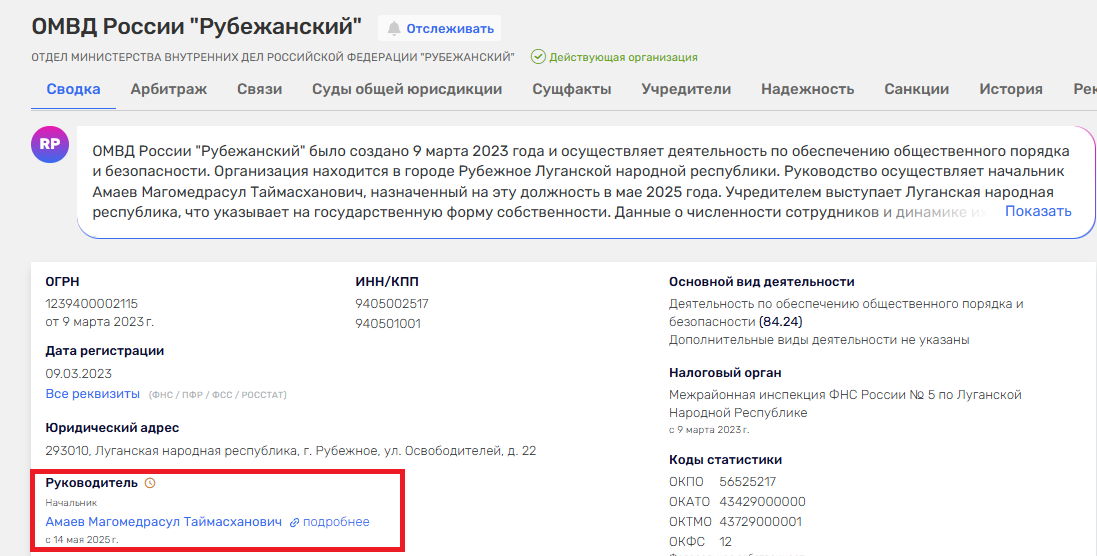 Першим із міст, де почалися такі кадрові ротації, стало Рубіжне — нині найближче до лінії фронту. У травні цього року підрозділ внутрішніх справ там очолив підполковник Амаєв Магомедрасул Таймасханович. Він родом із Дагестану та певний час служив у силових структурах на Північному Кавказі. Безпосередньо перед призначенням до Рубіжного Амаєв працював заступником начальника одного з відділів Волгодонського управління МВС Росії.