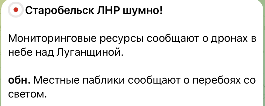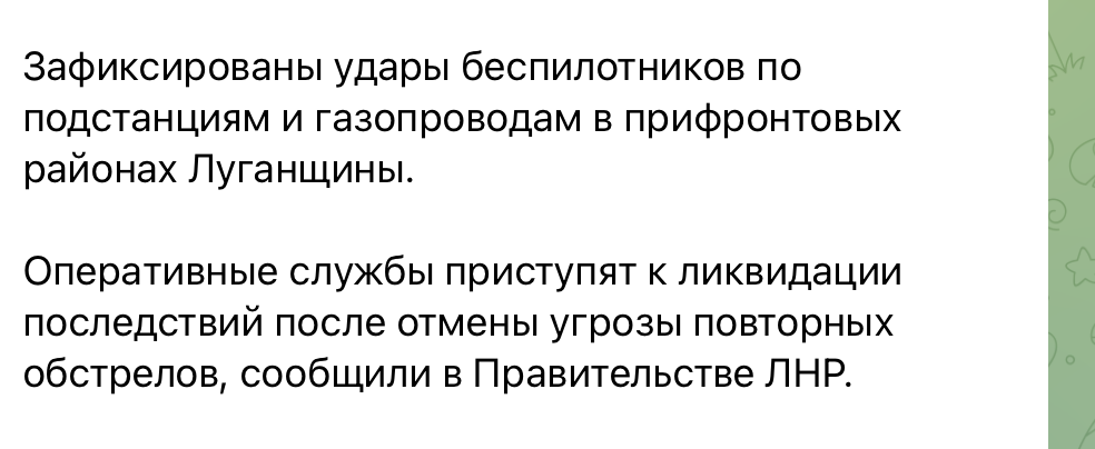 Також російські ЗМІ повідомляють про «удари безпілотників по підстанціях і газопроводах» у прифронтових районах Луганщини. Місцеві ресурси пишуть про перебої з електропостачанням. Оперативні служби окупантів нібито чекають на «скасування загрози повторних обстрілів», щоб розпочати роботи на місцях ураження.
