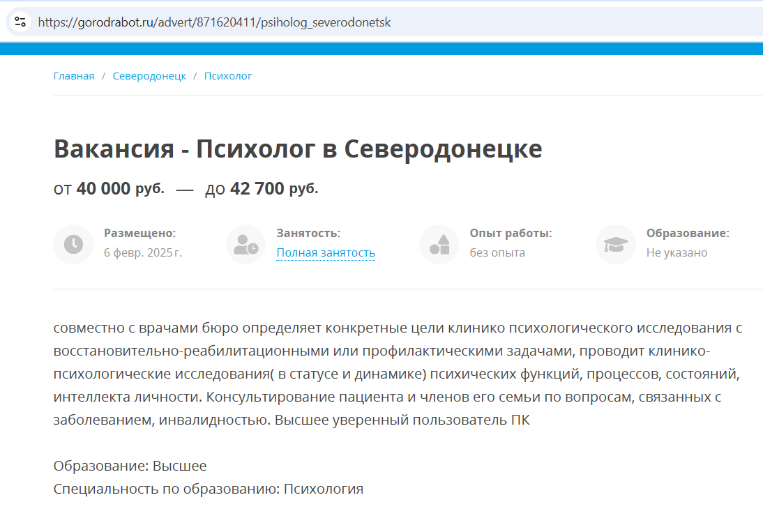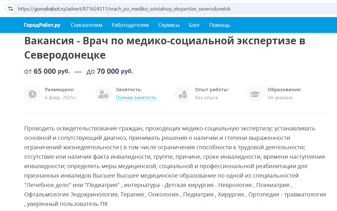 Нині в мережі багато оголошень про вакансії у медичних закладах. Зокрема, без досвіду роботи, лікарем МСЕК можна влаштуватись на оклад у ₽70000, а психологом на ₽40000.
