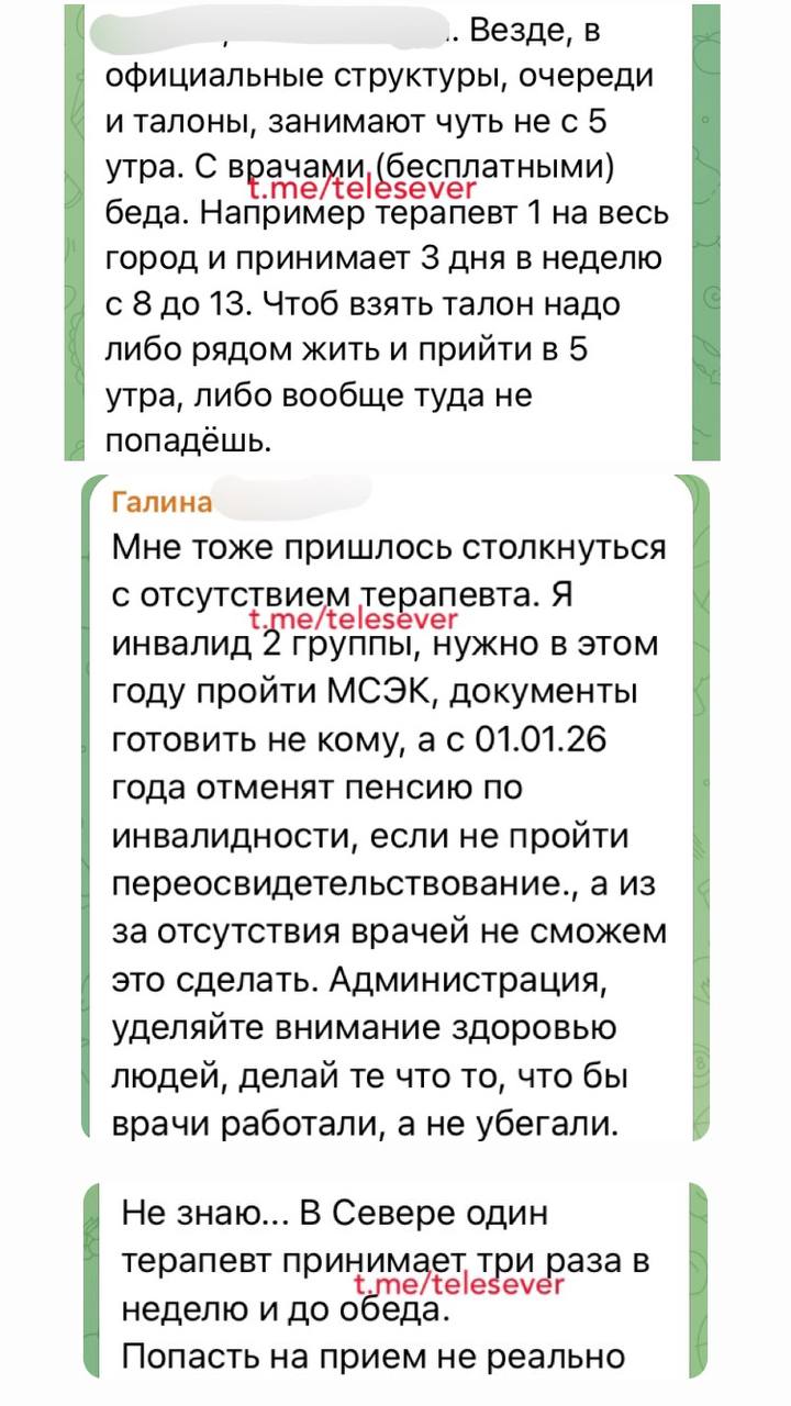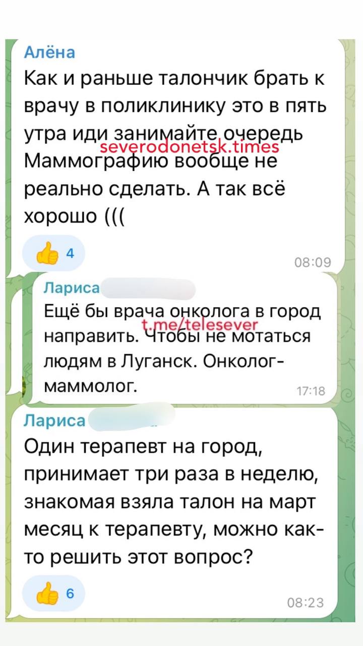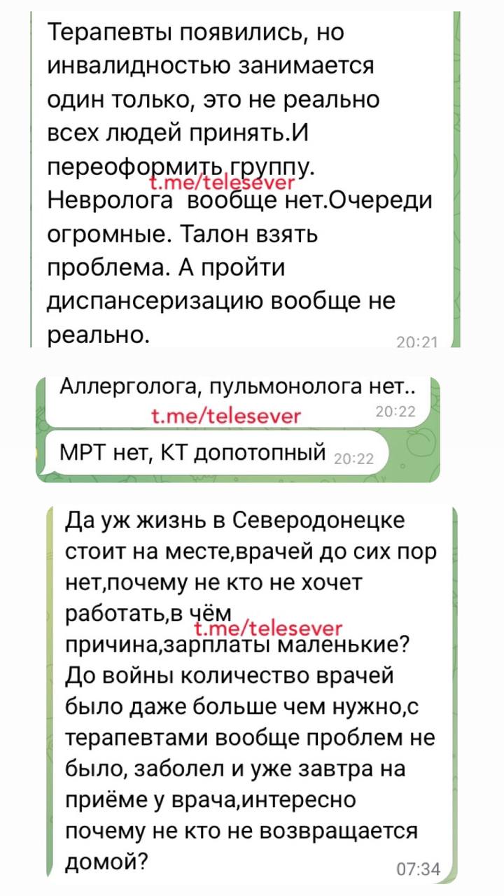 У нині окупованому Сіверськодонецьку ситуація така сама. Там люди змушені займати черги по талони засвітла, але і його наявність не є запорукою вдалого лікування: вузьких спеціалістів, як то невролога, алерголога, пульмонолога, онколога – немає. Так само бракує терапевтів – один на все місто він приймає людей декілька годин на день тричі на тиждень, а талони на прийом до нього нині видають аж на березень. МСЕК, жаліються люди, пройти неможливо через брак фахівців, які мають готувати документи, а несвоєчасне переоформлення інвалідності потягне за собою зняття соціальних виплат вже з наступного року. Відчутний брак педіатрів.