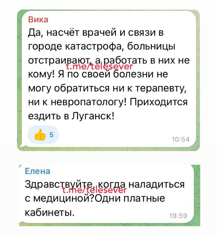 Мешканці окупованого Луганська скаржаться на медичну сферу, зокрема на ставлення лікарів до пацієнтів. За наявною інформацією навіть візит у платну клініку не є запорукою комфортного обслуговування та чіткого діагностування стану організму. Так, мешканка «столиці» т.з. «ЛНР» звернулась до нейрохірурга приватної клініки «Новамед», прийом в якій згідно до прайсу коштує ₽3000 (майже ₴1400). Втім, не отримавши там допомоги, звернулась до поліклініки де стала свіком ігнорування медперсоналом поганого стану літнього пацієнта та отримала негативне ставлення до самої себе: