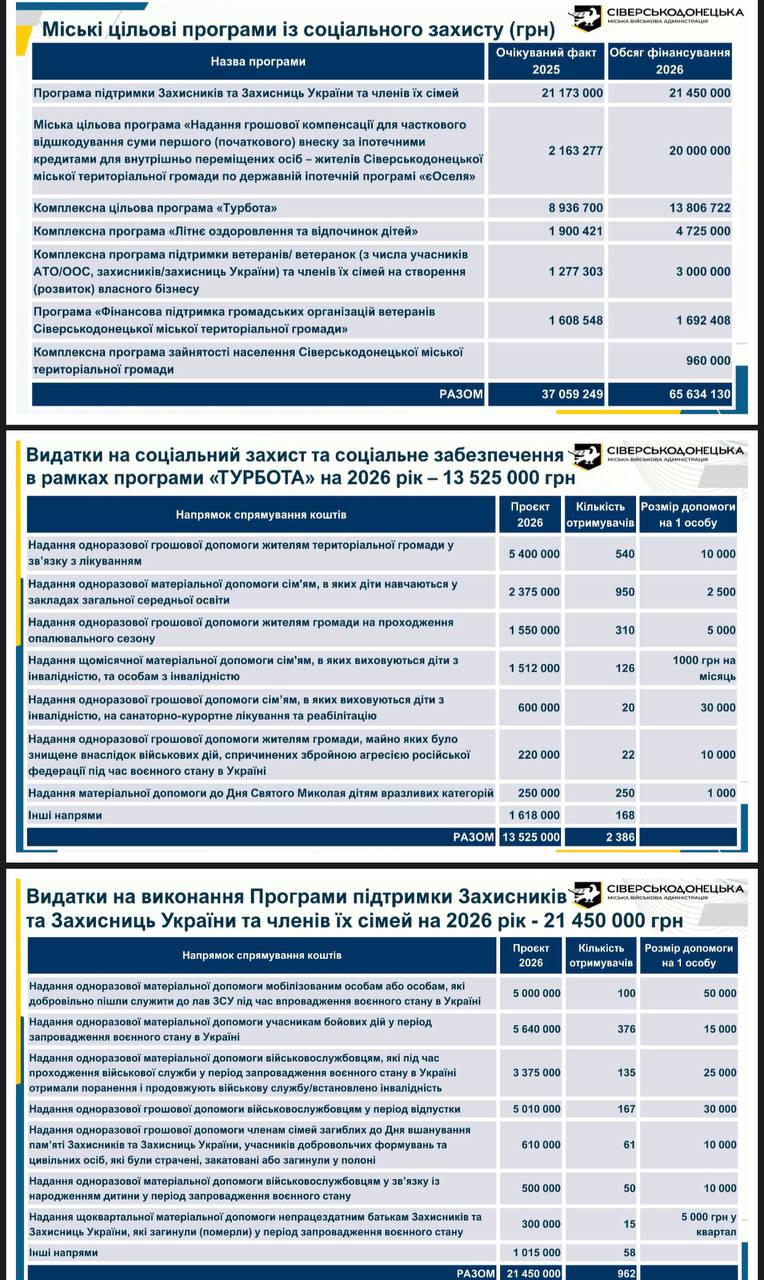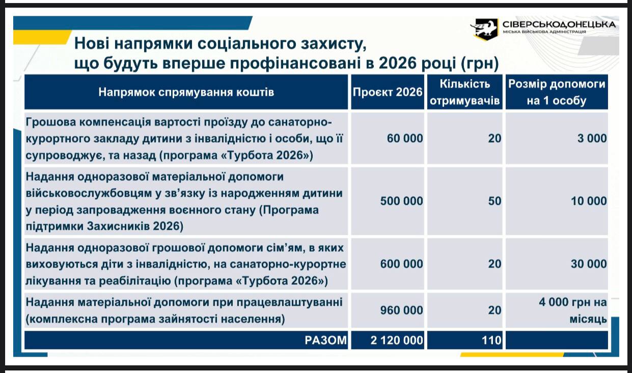 Загалом проєкт бюджету на 2026 рік спрямований на забезпечення стабільної життєдіяльності Сіверськодонецької громади в умовах обмеженого фінансового ресурсу та зосереджений на ключових соціальних і гуманітарних потребах.