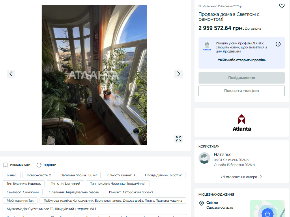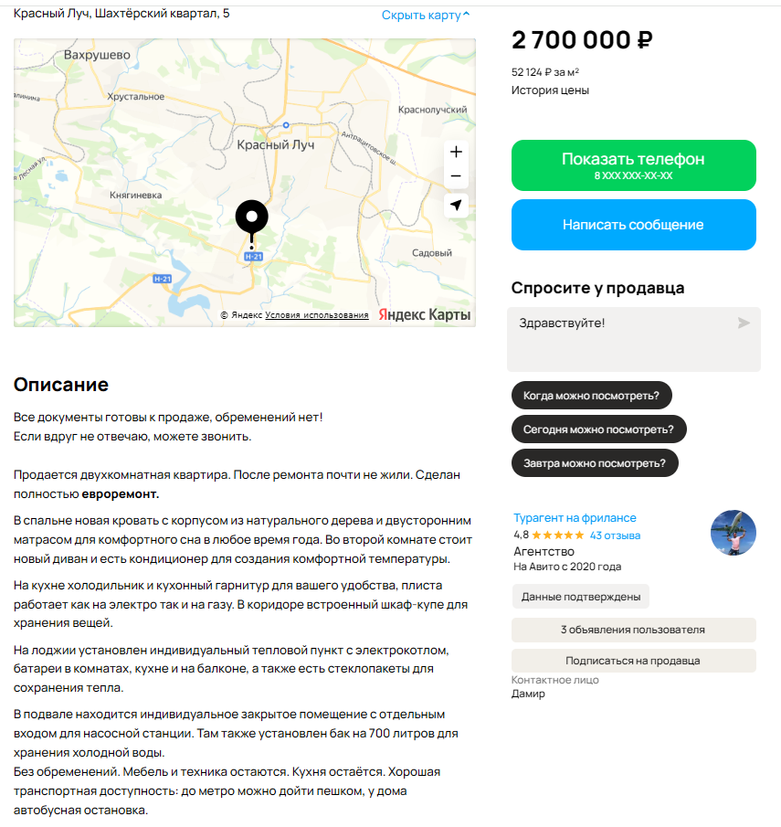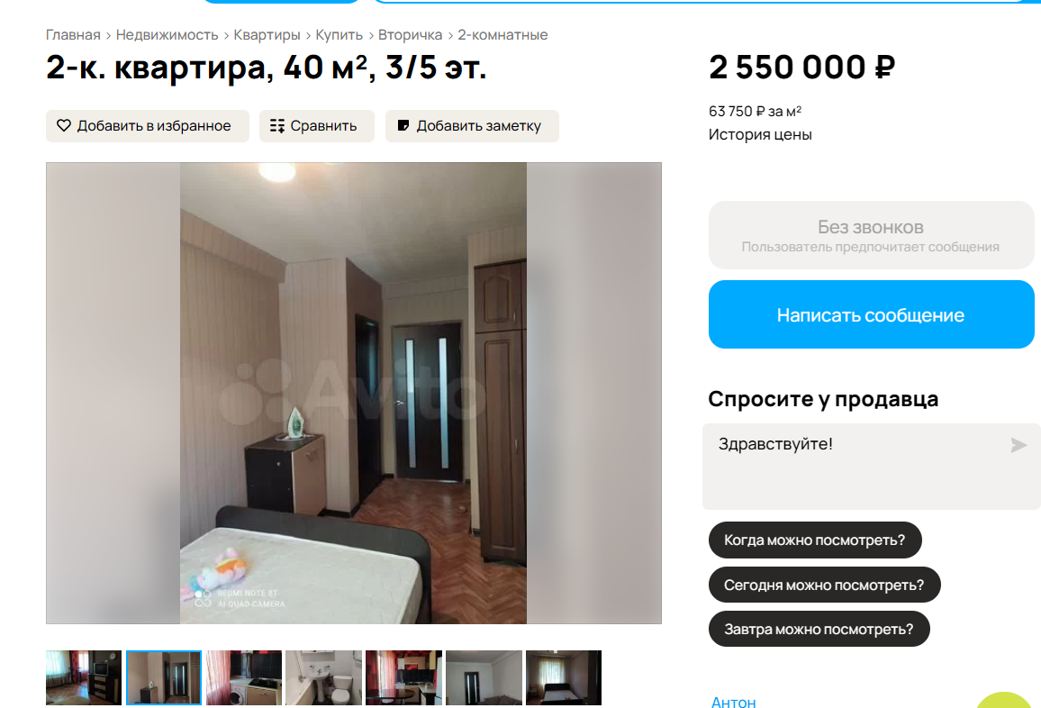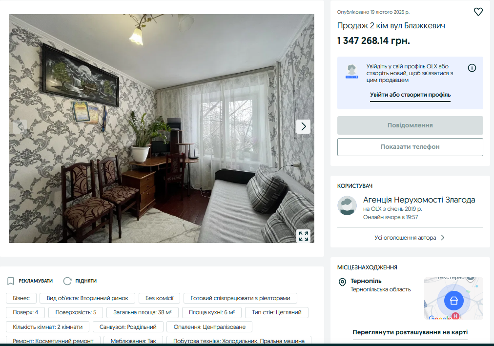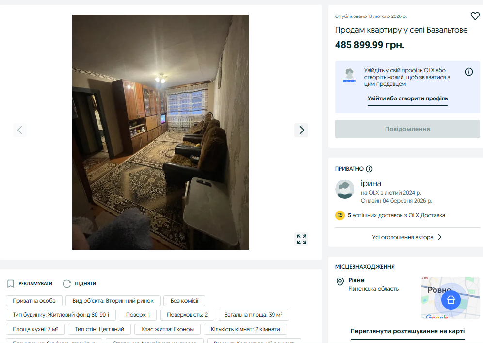 «Необхідний косметичний ремонт. Квартира зареєстрована в Росреєстрі. Хазяїн один. Обтяжень немає. Реальним покупцям торг», — йдеться в оголошенні