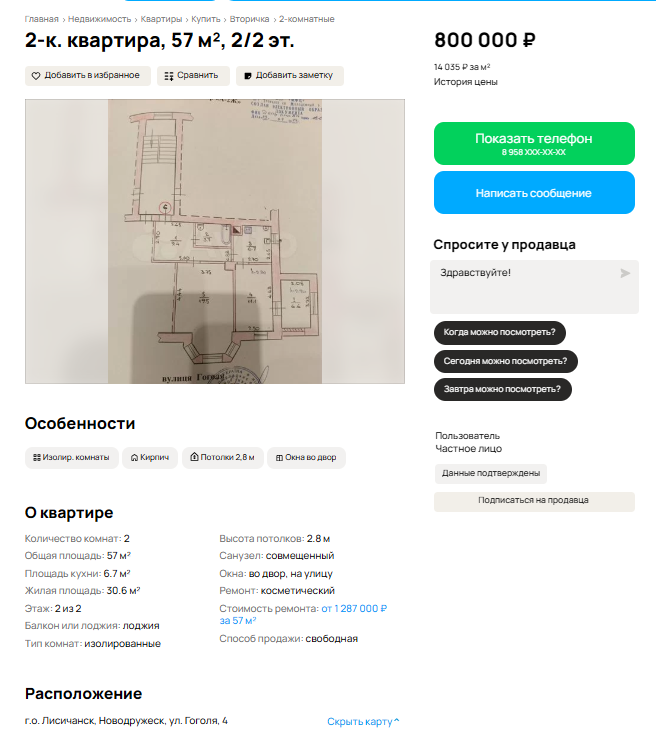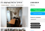 У Рубіжному, двокімнатну квартиру без ремонту на вторинці можна придбати за два мільйони рублів. Головна точка акценту продавця — будинок вцілів після наступу на місто росіян, а нині окупаційна влада веде в ньому ремонтні роботи із заміни вікон та комунікацій, в майбутньому, ймовірно, відбуватиметься заміна індивідуального опалення. На думку продавця, сам стан квартири потребує лише косметичного ремонту.