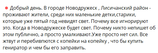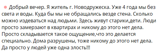 У сусідньому Новодружеську двокімнатна квартира коштує на порядок дешевше — 800 000 рублів. Утім і умови життя в місті гірші, за рубіжанські: світла та води в місті немає з початку повномасштабної війни, діти навчаються одягненими, тоді як класи опалюються буржуйками, «швидка» відмовляється їхати на виклик, а транспортне сполучення з сусідніми містами працює раз на три дні.