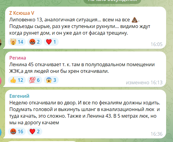 «У всіх індивідуальне опалення або повністю відсутнє. Деякі мають електричне. Ліфт із 2022 року не працює. Прибирають мешканці самі. Вікон у під’їзді та деяких квартирах немає. Дах тече. Миші живуть у квартирах. Навіть у квартирі з прямим прильотом, де стін немає – тариф все той самий – 27.68 за метр. У тарифі та централізоване опалення та ліфти та всякі огляди», — повідомляють місцеві.
