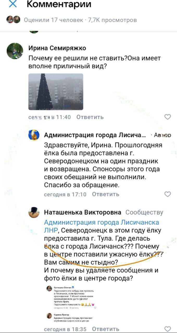 В адміністрації Лисичанська заявили, що минулорічну ялинку нібито брали в оренду у сусідньому Сіверськодонецьку. Також окупаційна влада спробувала виправдати незадовільний вигляд цьогорічної ялинки, пославшись на те, що якийсь спонсор не виконав своїх зобов’язань щодо організації новорічних заходів.